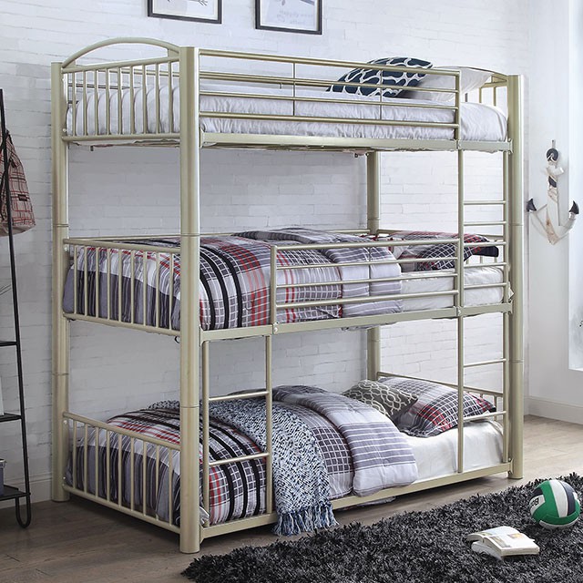 Furniture of America's Bettina triple bunk decker bunk is ideal for the growing family! With three twin beds, this bunk saves space and provides room for all! We love the geometric designs and metallic gold framework that are sure to delight your children. The contemporary design is constructed from metal and steel offering stability and safety. The safety guards and ladders are attached to ensure easy access and protection for children on the higher levels. This bunk is fun and convenient! Saving space and offering children a space to imagine and grow. Rent yours today at one of your local Central Rent 2 Own stores!