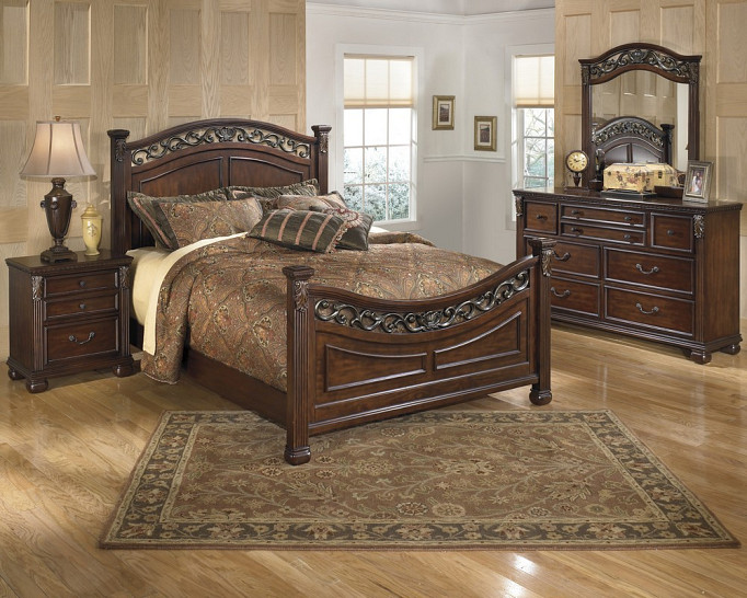 With the fluted pilasters beautifully adorned with leaf form corbels and cast foliage filigree bathed in a warm metallic color finish scrolling across the bed and mirror, the rich elegant design of the “Leahlyn” bedroom collection flawlessly captures the true essence of Old World styled furniture.