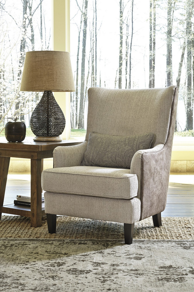 OverviewWith its sheltering feel and stunningly good looks, the Baxley accent chair with dual-sided upholstery is well worth a double take. Seating area’s chenille-feel upholstery is crisp, clean and purely delightful. Curvaceous back sports a faux suede fabric, elevating how cool a wingback chair can be. • Corner-blocked frame • Attached back and loose seat cushions • High-resiliency foam cushions wrapped in thick poly fiber • Kidney pillow with feather insert and hidden zipper • Polyester interior upholstery; polyester/vinyl exterior upholstery; polyester/linen pillow • Exposed legs with faux wood finish