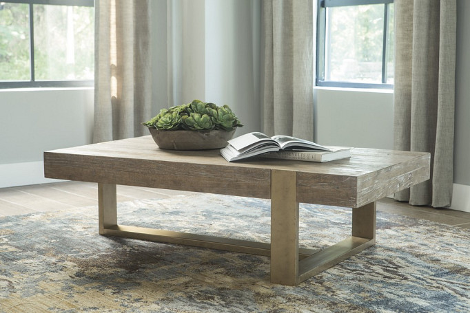 OverviewSmooth beauty and earthy elegance is discovered with the rectangular Brazin coffee table. Its simple steel frame design supports a table top that is certain to draw your eye. Full of natural character, it's perfect for adding a touch of modern flair to any seating arrangement. • Table top made of solid and engineered wood • Wire-brushed white waxy gray finish • Tubular base made of steel in goldtone finish
