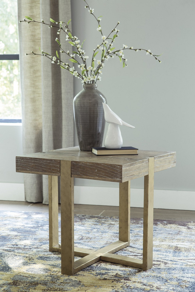 OverviewSmooth beauty and earthy elegance is discovered with the square Brazin end table. Its simple steel frame design supports a table top that is certain to draw your eye. Full of natural character, it's perfect for adding a touch of modern flair to any seating arrangement. • Table top made of solid and engineered wood • Wire-brushed white waxy gray finish • Tubular base made of steel in goldtone finish